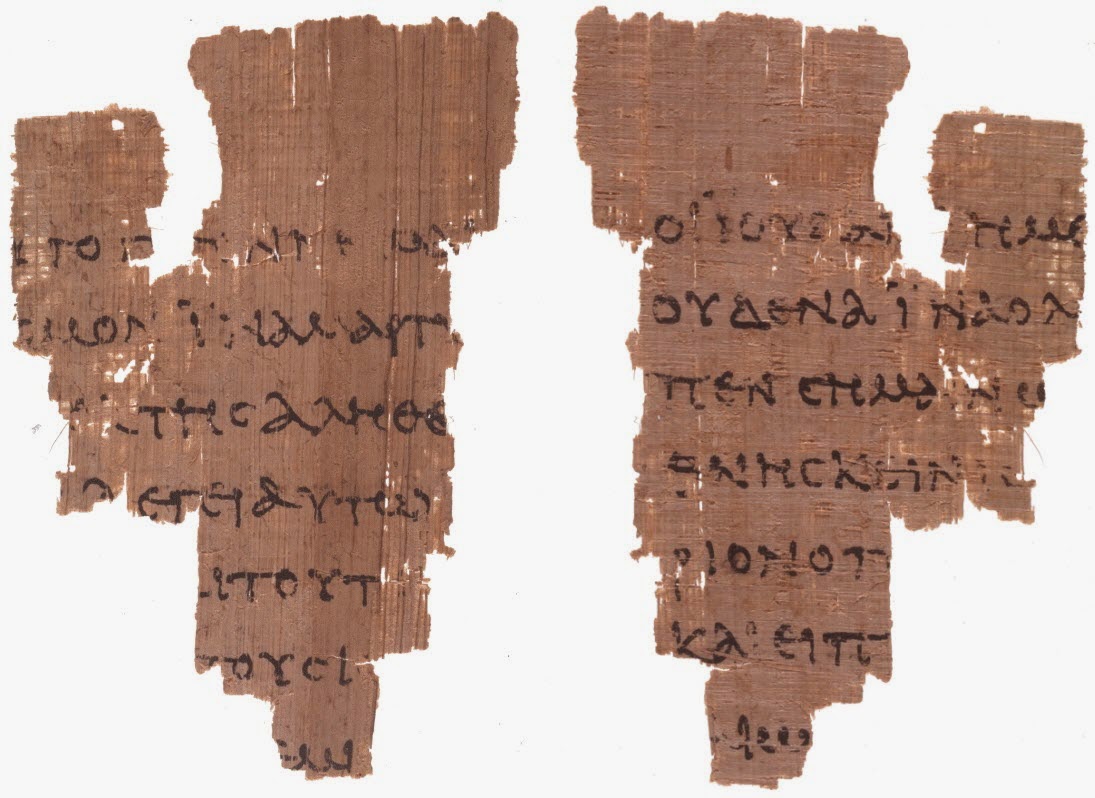 上图:目前已发现最早的约翰福音蒲草纸抄本的残简,代号Rylands P52,包括约十八31-33, 37- 38。根据字体的形状,抄写年代可能是主后90-125年。